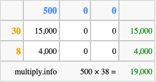 Below is an illustration showing you how to calculate 500 times 38 using the box method, using the instructions above.