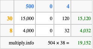 Finally, we add up all the sums we found in step 3 to get our final answer to 504 times 38.