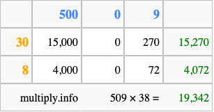 Finally, we add up all the sums we found in step 3 to get our final answer to 509 times 38.
