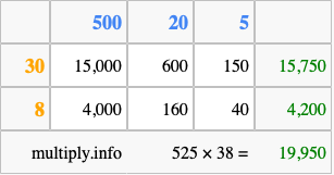 Finally, we add up all the sums we found in step 3 to get our final answer to 525 times 38.