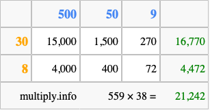 Below is an illustration showing you how to calculate 559 times 38 using the box method, using the instructions above.