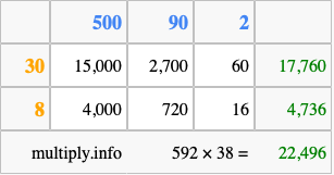 Finally, we add up all the sums we found in step 3 to get our final answer to 592 times 38.