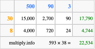 That's all there is to it! As you can see from the box above, the answer to 593 times 38 using the box method is 22,534.