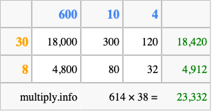 Finally, we add up all the sums we found in step 3 to get our final answer to 614 times 38.