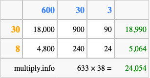 Finally, we add up all the sums we found in step 3 to get our final answer to 633 times 38.