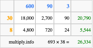 That's all there is to it! As you can see from the box above, the answer to 693 times 38 using the box method is 26,334.