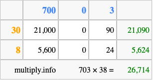 That's all there is to it! As you can see from the box above, the answer to 703 times 38 using the box method is 26,714.