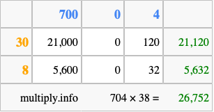 Below is an illustration showing you how to calculate 704 times 38 using the box method, using the instructions above.