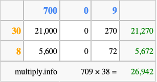 That's all there is to it! As you can see from the box above, the answer to 709 times 38 using the box method is 26,942.