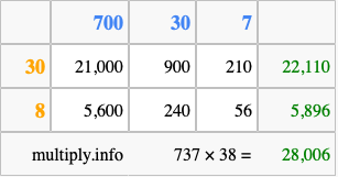 Below is an illustration showing you how to calculate 737 times 38 using the box method, using the instructions above.
