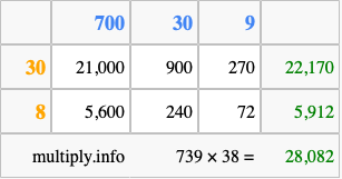 That's all there is to it! As you can see from the box above, the answer to 739 times 38 using the box method is 28,082.