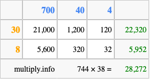 Finally, we add up all the sums we found in step 3 to get our final answer to 744 times 38.