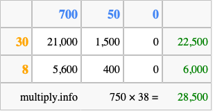Finally, we add up all the sums we found in step 3 to get our final answer to 750 times 38.