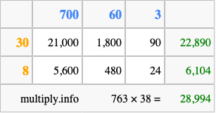 That's all there is to it! As you can see from the box above, the answer to 763 times 38 using the box method is 28,994.