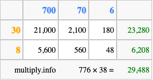 Finally, we add up all the sums we found in step 3 to get our final answer to 776 times 38.