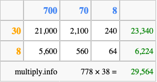 Finally, we add up all the sums we found in step 3 to get our final answer to 778 times 38.