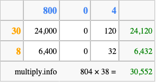 That's all there is to it! As you can see from the box above, the answer to 804 times 38 using the box method is 30,552.