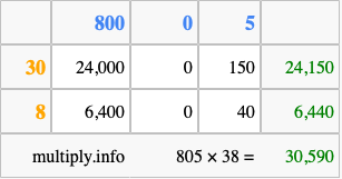 Finally, we add up all the sums we found in step 3 to get our final answer to 805 times 38.