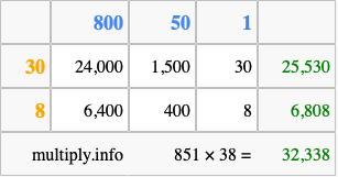 Finally, we add up all the sums we found in step 3 to get our final answer to 851 times 38.