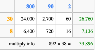 Finally, we add up all the sums we found in step 3 to get our final answer to 892 times 38.