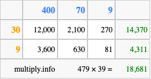 That's all there is to it! As you can see from the box above, the answer to 479 times 39 using the box method is 18,681.