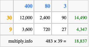 Below is an illustration showing you how to calculate 483 times 39 using the box method, using the instructions above.