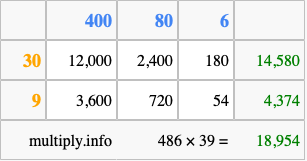 Finally, we add up all the sums we found in step 3 to get our final answer to 486 times 39.