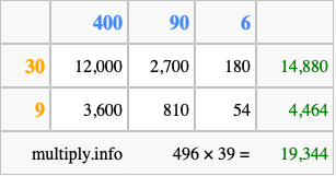 Finally, we add up all the sums we found in step 3 to get our final answer to 496 times 39.