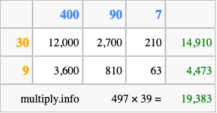 Finally, we add up all the sums we found in step 3 to get our final answer to 497 times 39.