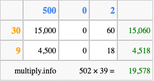 Finally, we add up all the sums we found in step 3 to get our final answer to 502 times 39.