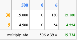 That's all there is to it! As you can see from the box above, the answer to 506 times 39 using the box method is 19,734.