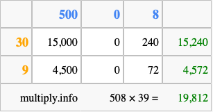 Below is an illustration showing you how to calculate 508 times 39 using the box method, using the instructions above.