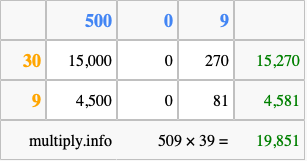 Finally, we add up all the sums we found in step 3 to get our final answer to 509 times 39.