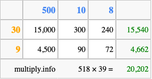 Below is an illustration showing you how to calculate 518 times 39 using the box method, using the instructions above.