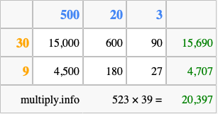 Below is an illustration showing you how to calculate 523 times 39 using the box method, using the instructions above.