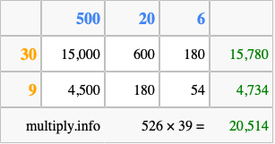 Finally, we add up all the sums we found in step 3 to get our final answer to 526 times 39.
