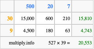 Below is an illustration showing you how to calculate 527 times 39 using the box method, using the instructions above.