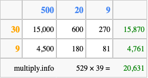 That's all there is to it! As you can see from the box above, the answer to 529 times 39 using the box method is 20,631.