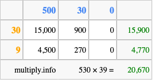 That's all there is to it! As you can see from the box above, the answer to 530 times 39 using the box method is 20,670.
