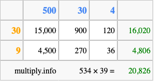 That's all there is to it! As you can see from the box above, the answer to 534 times 39 using the box method is 20,826.