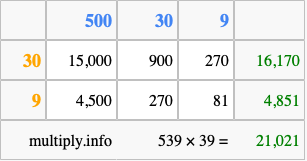 Finally, we add up all the sums we found in step 3 to get our final answer to 539 times 39.