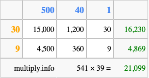 Below is an illustration showing you how to calculate 541 times 39 using the box method, using the instructions above.