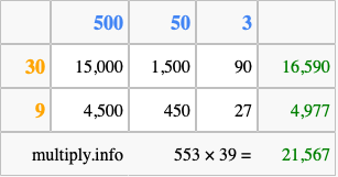 Below is an illustration showing you how to calculate 553 times 39 using the box method, using the instructions above.