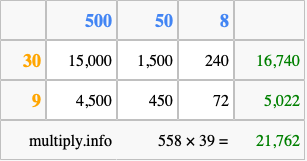 That's all there is to it! As you can see from the box above, the answer to 558 times 39 using the box method is 21,762.