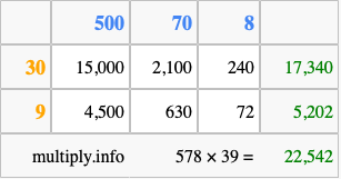 Below is an illustration showing you how to calculate 578 times 39 using the box method, using the instructions above.