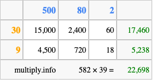 That's all there is to it! As you can see from the box above, the answer to 582 times 39 using the box method is 22,698.