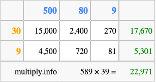Below is an illustration showing you how to calculate 589 times 39 using the box method, using the instructions above.