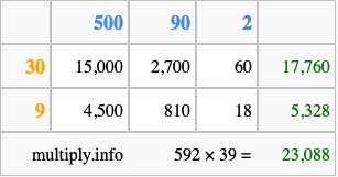 Finally, we add up all the sums we found in step 3 to get our final answer to 592 times 39.