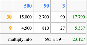 Below is an illustration showing you how to calculate 593 times 39 using the box method, using the instructions above.