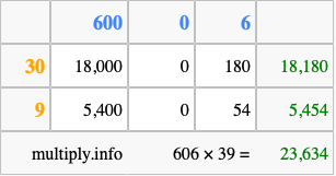 Finally, we add up all the sums we found in step 3 to get our final answer to 606 times 39.